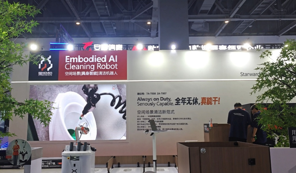 在星物种机器人科技有限公司展台,数台空间场景(具身智能)清洁机器人正熟练地清洁着展台现场的地板、马桶和台面,引发许多观众围观。