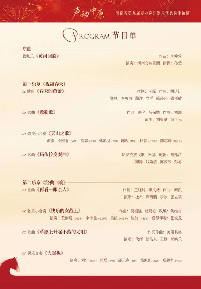 整场演出涵盖声乐和器乐多种形式,以“序曲”《黄河回旋》及“四个乐章”的结构展开,从《祝福春天》到《经典回响》,从《家国同梦》到《跃马新程》,既有对美好春天的歌颂向往,又有唤起岁月记忆的经典回顾,既有对祖国家乡的深沉礼赞,又有对中原儿女在新时代新征程上跃马扬鞭、砥砺前行的新年祝福。