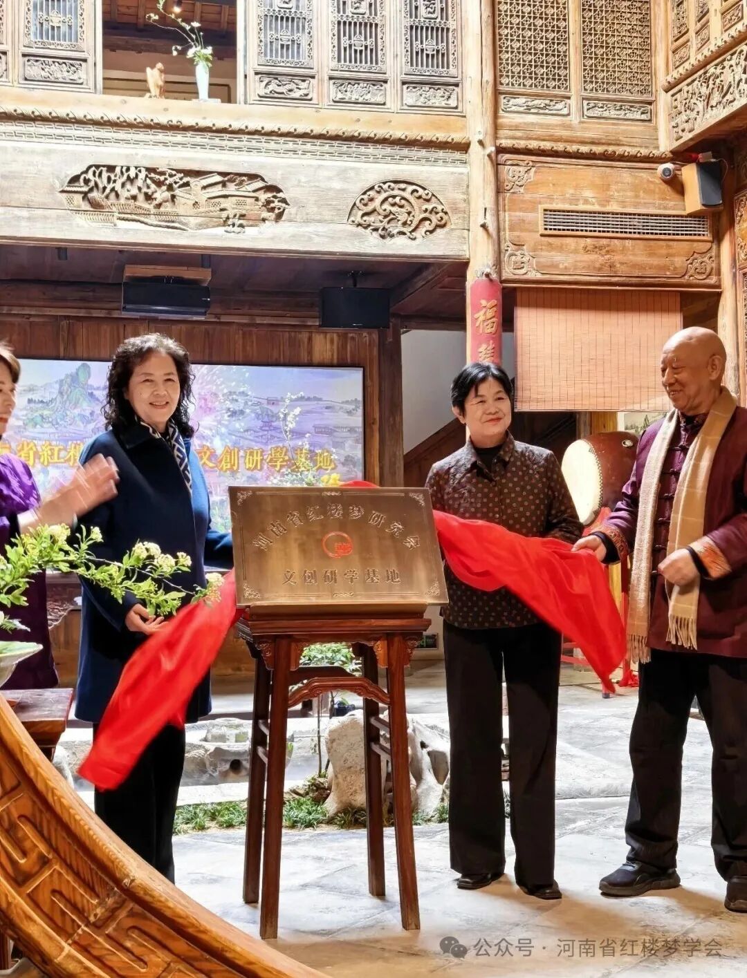 在全场嘉宾的共同见证下,河南省红楼梦研究会会长闵虹、郑州非遗保护和文旅文创融合发展中心主任李桂玲、郑州汲古文化艺术研究院院长张胜吾、河南汲古文化产业有限公司总经理李阿娟一同上台,为“河南省红楼梦研究会文创研学基地——瞻园”揭牌。