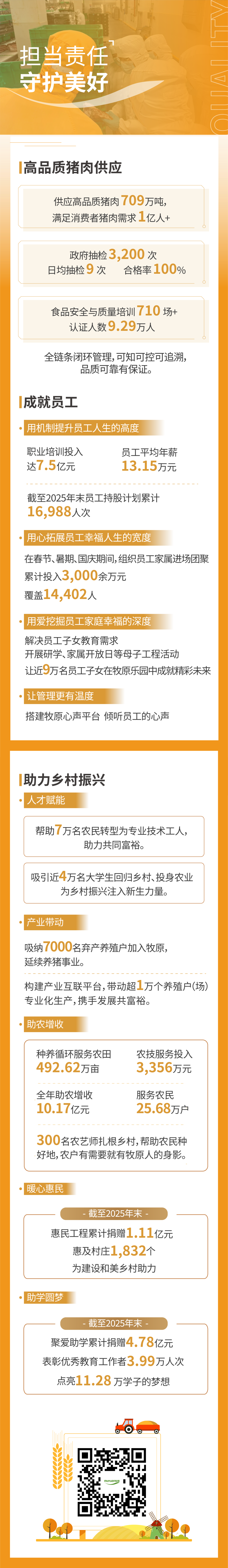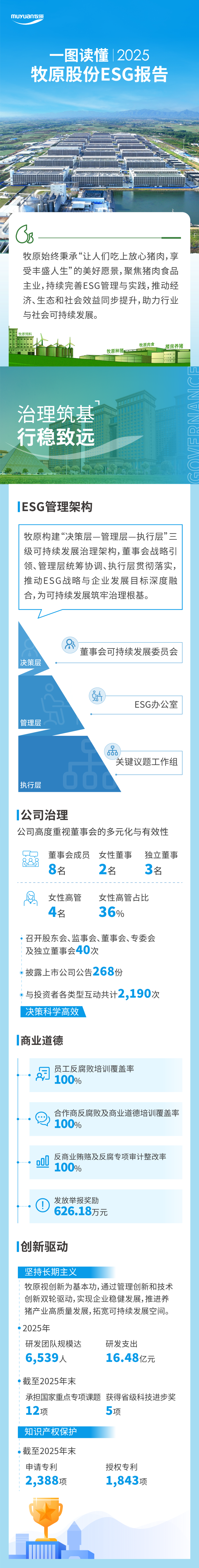 近日,牧原食品股份有限公司(股票代码:002714.SZ、02714.HK)正式发布《2025 年度环境、社会及治理(ESG)报告》。作为公司自 2013 年以来连续发布的第 12 份 ESG 报告,本次报告全面展现了牧原在绿色低碳、食品安全、科技创新、社会责任及公司治理等领域的年度实践与丰硕成果,系统呈现了龙头农牧企业在可持续发展道路上的深度探索与标杆实践。