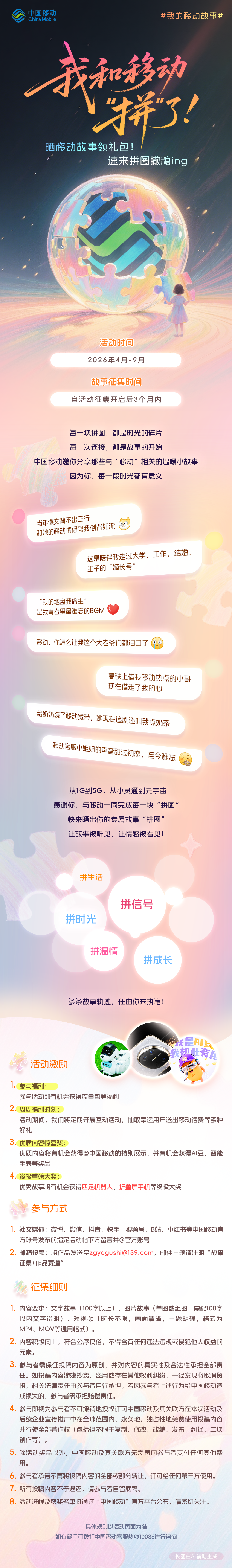 至于大家最关心的奖品,中国移动4月15日将从所有已发布故事的参与者中,抽取1位幸运用户送出华为Mate60 Pro手机,后续还有更多智能耳机、话费大礼包等移动好礼。